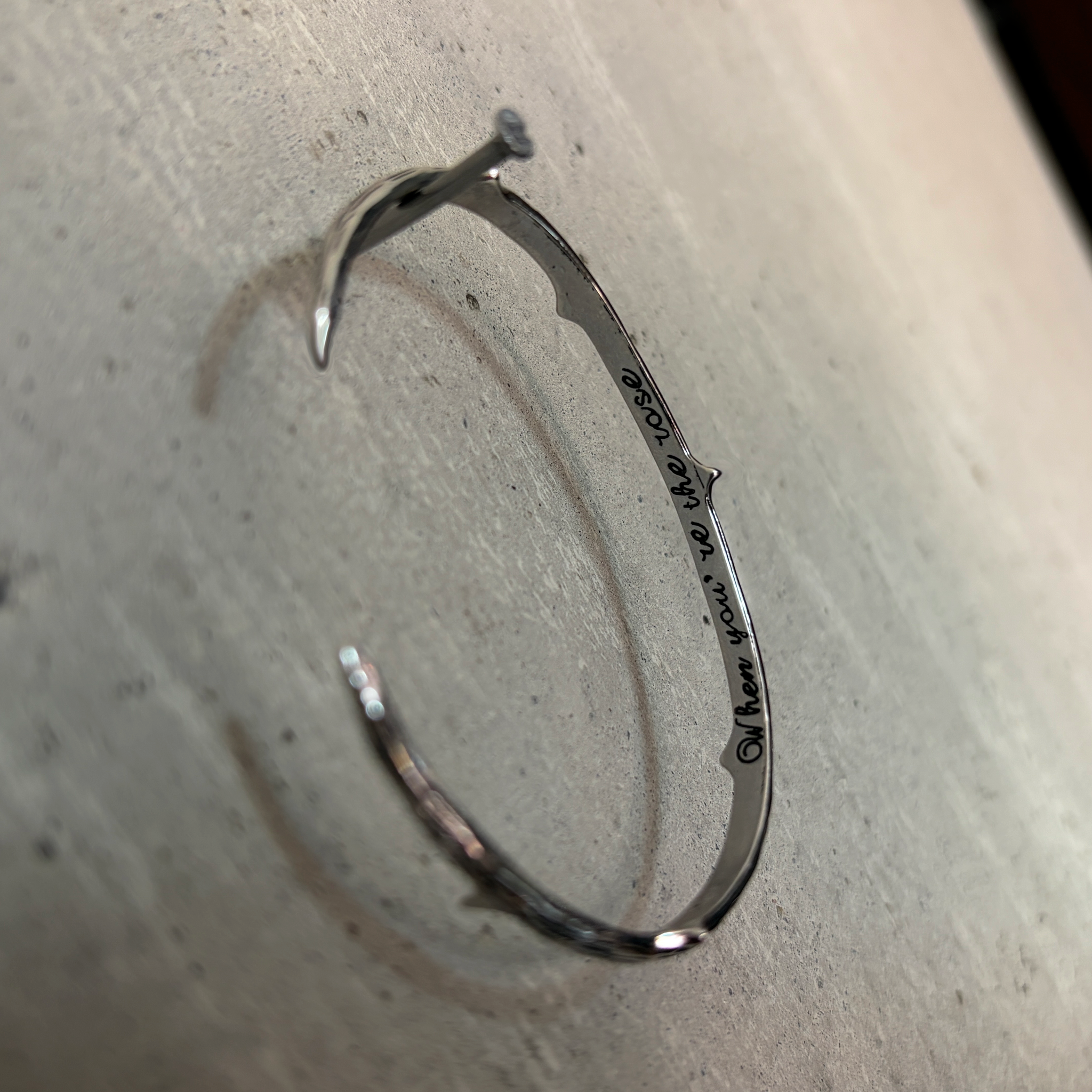 Brazalete abierto con diseño de espinas e inscripción interior. Acero inoxidable plateado con acabado pavonado que resalta los detalles del diseño.